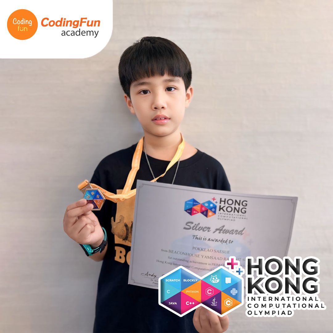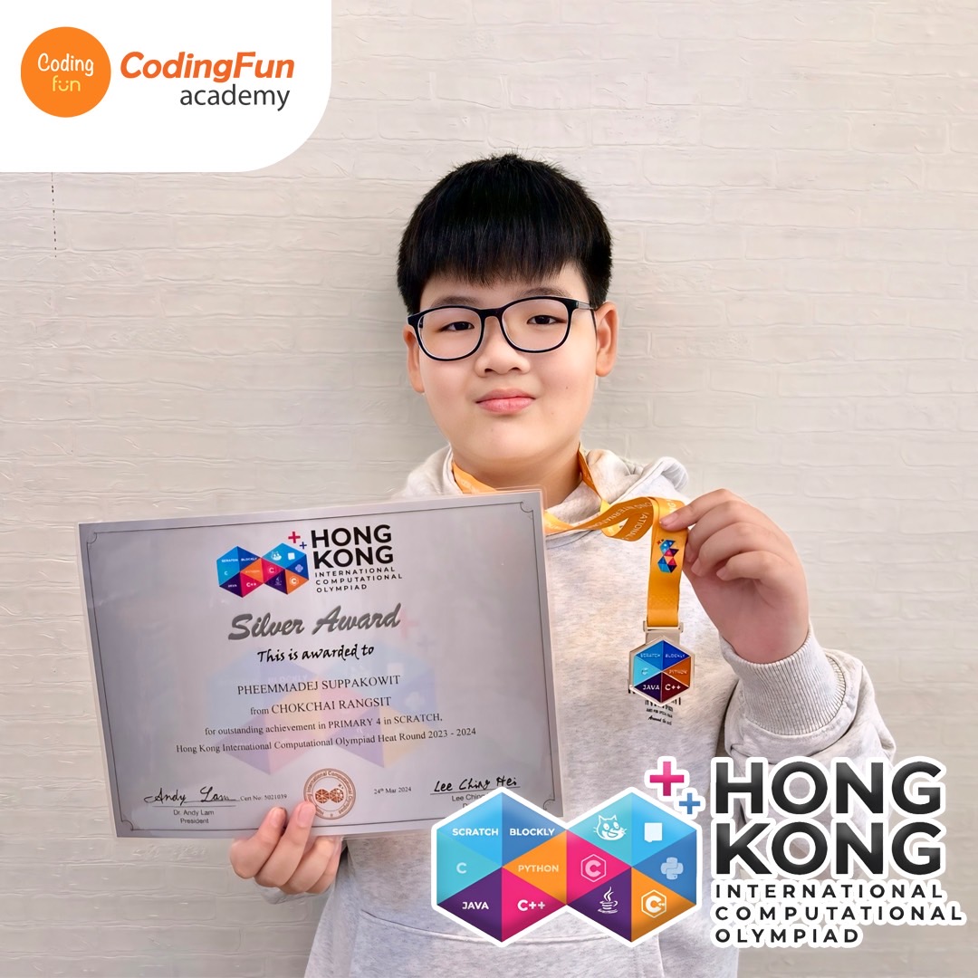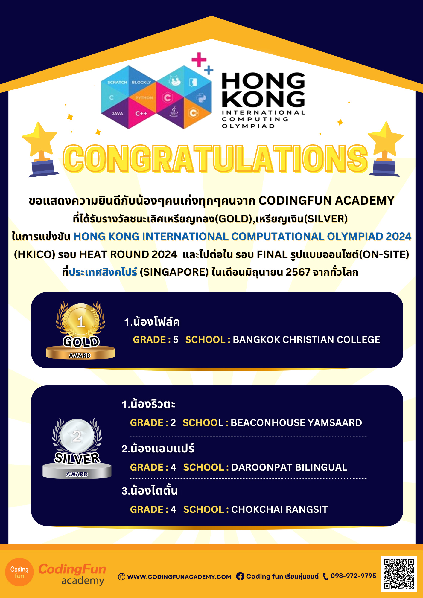 ขอแสดงความยินดีกับน้องๆคนเก่งทุกๆคนจาก CODINGFUN ACADEMY ที่ได้รับรางวัลชนะเลิศเหรียญทอง(GOLD),เหรียญเงิน(SILVER) ในการแข่งขัน Hong Kong International Computational Olympiad 2024 (HKICO) รอบ HEAT ROUND 2024